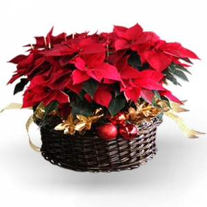 Arreglo con 4 o 5 nochebuenas grandes en canastacon motivos navideños.