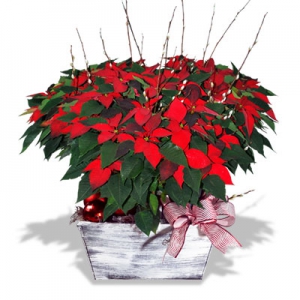 Arreglo con 4 plantas Nochebuena grandes en base de madera color chocolate con motivos navideños.