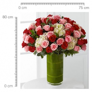 Arreglo con 50 rosas calidad platinum en tonos rojo y rosa acompañado de hortencias en florero de vidrio tubular alto.
